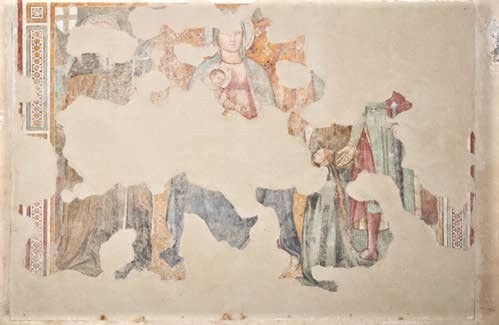 Opera di Agostino di Marsilio, prima metà del XV secolo, è l’affresco staccato – proveniente dalla parete destra e ora posto nella controfacciata – della Madonna col Bambino tra sant’Antonio abate, san Giuliano (?) e una donatrice. Presenta ampie lacune e sant’Antonio, a sinistra, è riconoscibile per l’abito e il bastone. In basso a destra è raffigurata la donatrice – una bella figura femminile dai lunghi capelli biondi presentata dal santo cavaliere.