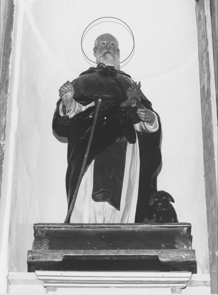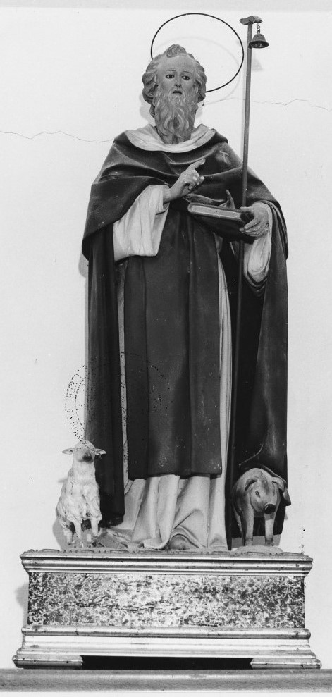 Il Santo è rappresentato in piedi, vestito con l’abito dell’Ordine, con la mano sinistra regge un libro sul quale arde una fiamma. La mano destra regge la parte superiore del bastone spezzato e la campanella. Sul piedistallo, a destra, è un animale poco riconoscibile nella fotografia, ma che dovrebbe essere il consueto maiale.