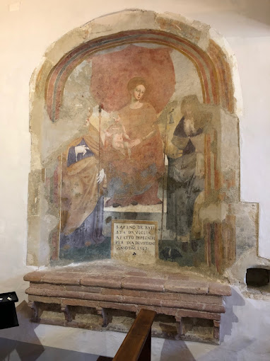 Nella nicchia di destra è affrescata una Madonna col Bambino tra un santo vescovo e Sant’Antonio abate.
