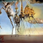 A destra, in alto sopra le nuvole, l’Escorial, il castello-monastero di re Filippo II di Spagna, che Dalì eleva a simbolo della potenza dell’ordine divino e del superamento delle tentazioni.