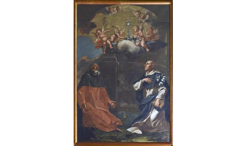 Olio su tela di 180 x 220 cm raffigurante: “Gloria del Santissimo adorato da Sant’Antonio abate e da San Domenico”.