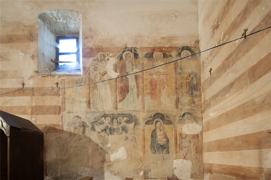 Tra quelli del XV secolo, vi è, nel registro superiore della parete destra, sant’Onofrio, quasi completamente perduto per l’apertura di una finestra, san Leonardo, santa Barbara, sant’Elena e sant’Antonio abate. Sant’Antonio abate, all’estrema destra, tiene con la mano sinistra un libro dalla copertina rossa e con la destra un bastone cui è appesa una campanella.