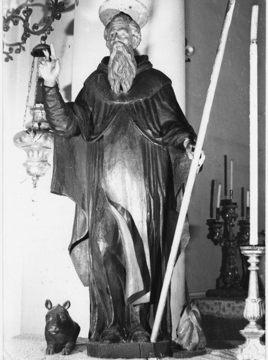La statua lignea è alta 155 cm, il Santo ha la mano destra nel gesto di benedizione, la sinistra teneva un bastone, oggi scomparso. Ai suoi piedi, a destra una fiamma. Nella fotografia del Catalogo Beni Culturali vi era anche, indipendente, la statua di un maialino.