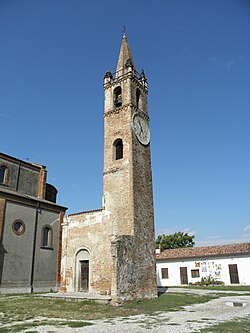 Campanile con basamento a pianta quadrangolare; fusto interamente edificato in mattoni di cotto a vista; cella campanaria a monofore, coronata in sommità da quattro pinnacoli e copertura a cuspide in laterizio.