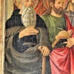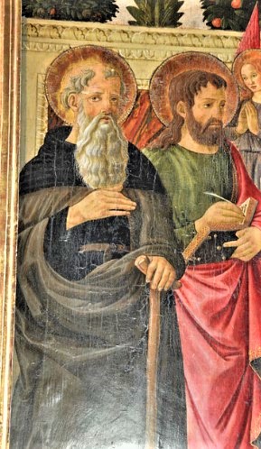 Sant’Antonio è dipinto all’estrema sinistra, con saio, mantello, barba bianca e bastone a tau nella mano sinistra. Una maialino della cinta senese è ai suoi piedi.