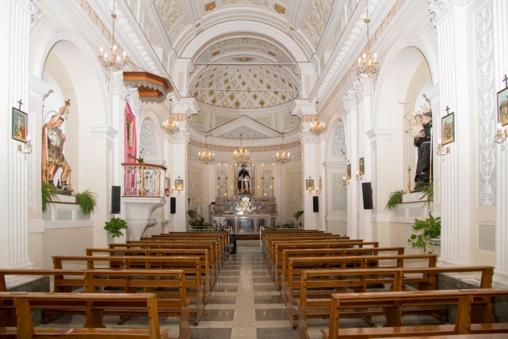 L’interno riccamente decorato è ad aula unica e presenta sei cappelle laterali e altare maggiore in marmo, la volta è a botte cassettonata; la commistione di elementi decorativi dell’interno inducono a pensare ad una mano ottocentesca.