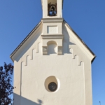 Il campanile, a torretta, è posto presso l’incontro degli spioventi in facciata, in forte aggetto; il fusto quadrangolare, delimitato da cornici e ornato da una specchiatura recante la data “1891”, è sostenuto da due modiglioni modanati raccordati da un arco a sesto ribassato. Un secondo modesto campanile a torretta in legno sorge sulla linea di colmo presso il presbiterio, coperto da una cuspide piramidale in lamiera metallica.