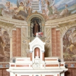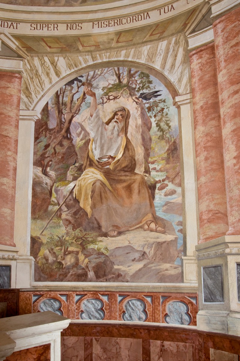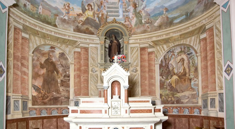 Al 1945 risale l’impianto decorativo ad affresco delle pareti interne, realizzato dal pittore itinerante Teodoro Fengler de Vogg (attivo in zona dal 1934 al 1945).
