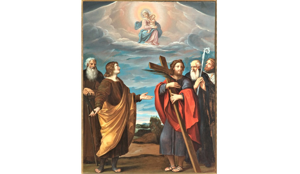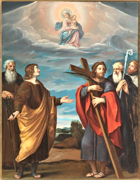 Olio su tela di 89 x 116 cm. Raffigura “Santi Antonio abate, Giovanni Evangelista, Andrea, Benedetto e Luigi in adorazione della Madonna con Bambino in gloria”.