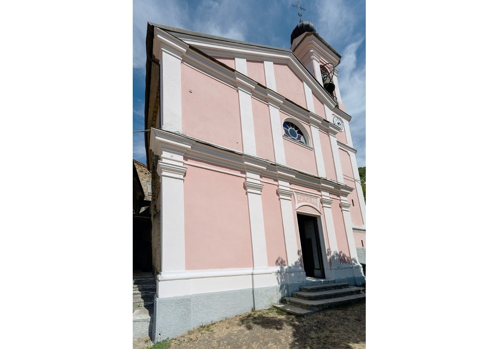 La facciata a capanna, intonacata, è suddivisa in due registri da paraste doriche sorreggenti una aggettante trabeazione, mentre è ripartita orizzontalmente in quattro differenti parti. Nel registro inferiore centrale si trova l’unico portone di ingresso. Il registro superiore ospita la lunetta centrale. A coronamento della facciata il timpano incompleto sul fianco destro a causa della presenza del campanile. Il campanile, di sezione quadra, è posto sul fianco destro della facciata e la struttura risulta inglobata nella navata.