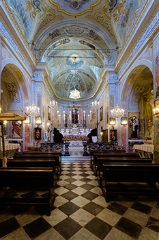Schema planimetrico a navata unica, con cappelle laterali è presbiterio allungato con abside curvilinea; l’abside è rialzato rispetta al piano dell’aula mentre il fonte battesimale è posto sul fianco sinistro. La copertura è a botte.