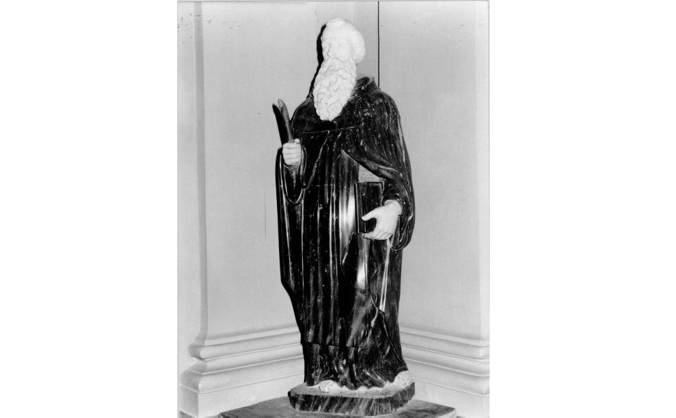 Scultura lignea policromata di 186 x 56 cm, opera di P. Purger, come da iscrizione sulla base: “ARTE SACRA / P. PURGER / FORNITORE PONTIFICIO / ORTISEI BOLZANO / VAL GARDENA (ITALIA)”. Datata la XX secolo,