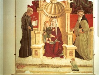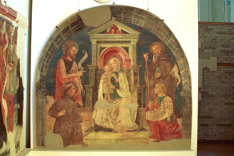 3) Affresco staccato di 243 x 260 cm, raffigura: “Madonna col Bambino, san Francesco d’Assisi, san Giovanni Battista, sant’Antonio abate e san Venanzio”, 1462
