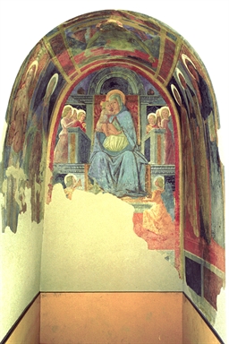 Affresco di 200 x 200 cm; raffigura: “Madonna in trono con Bambino e angeli, San Sebastiano, Madonna della Misericordia, Santa Caterina d’Alessandria, San Nicola da Tolentino, Sant’Antonio abate e Cristo in pietà”, 1475-1478 circa.