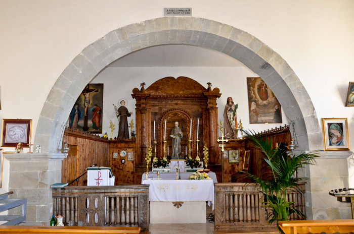 La pianta è rettangolare ad aula unica, con presbiterio quadrangolare, in posizione absidale, rialzato di un gradino dal piano dell’aula, separato da un arco santo in conci lapidei con sottostante balaustra in legno.