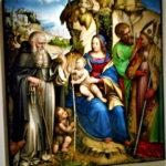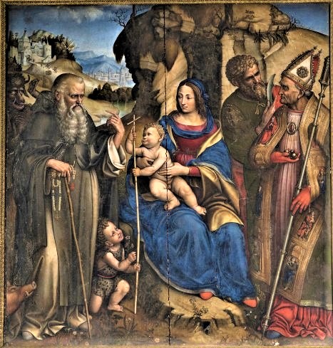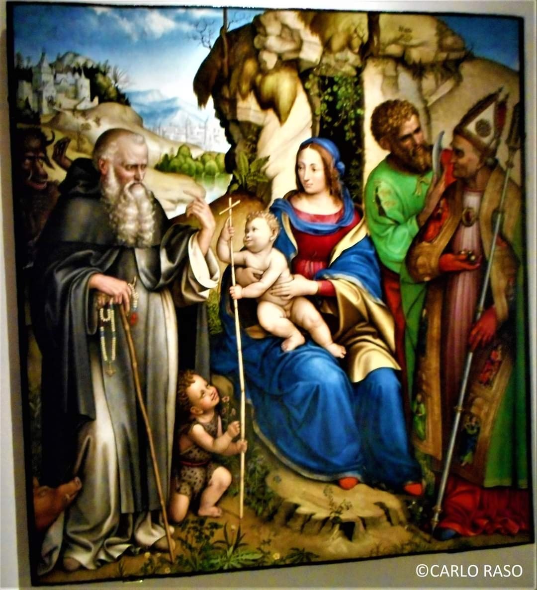 Sant’Antonio è sulla sinistra del quadro, tiene nella mano destra il bastone e un rosario. Un maiale zannuto, di cui si vede solo la parte anteriore, è ai suoi piedi.
