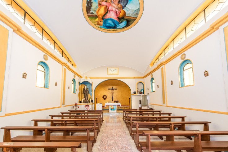 La chiesa presenta all’interno un’aula absidata con decorazioni a effetto marmo con volta a vela intonacata. Le aperture laterali disposte sopra la cornice ricalcano la forma della copertura.