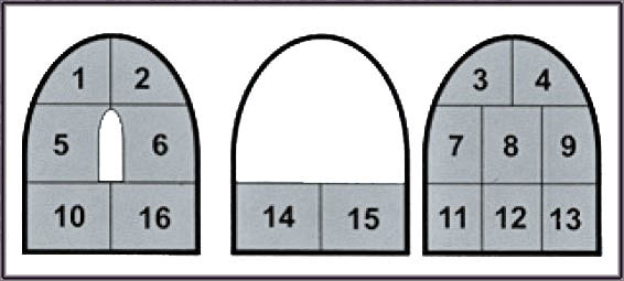 Sulle lunette: (1) Vocazione di s. Antonio; (2) Donazione dei beni ai poveri; (3) Vestizione del Santo; (4) Prima tentazione. Sulle pareti: (5) Altra tentazione; (6) Ricostruzione dell’oratorio; (7) Cacciata del serpente; (8) Apparizione di un angelo al re di Palestina; (9) Invio di una carovana da parte del re; (10) Arrivo della carovana presso la spelonca; (11) Apparizione del monaco Agatone (secondo la “leggenda” era in forma di satiro); (12) Benedizione del monaco; (13) Visita dei due eremiti ad altri monaci; (14) Apparizione del corvo a s. Antonio e a s. Paolo; (15) Morte dell’eremita Paolo; (16) “Funerali” o ostensione delle spoglie di s. Antonio.