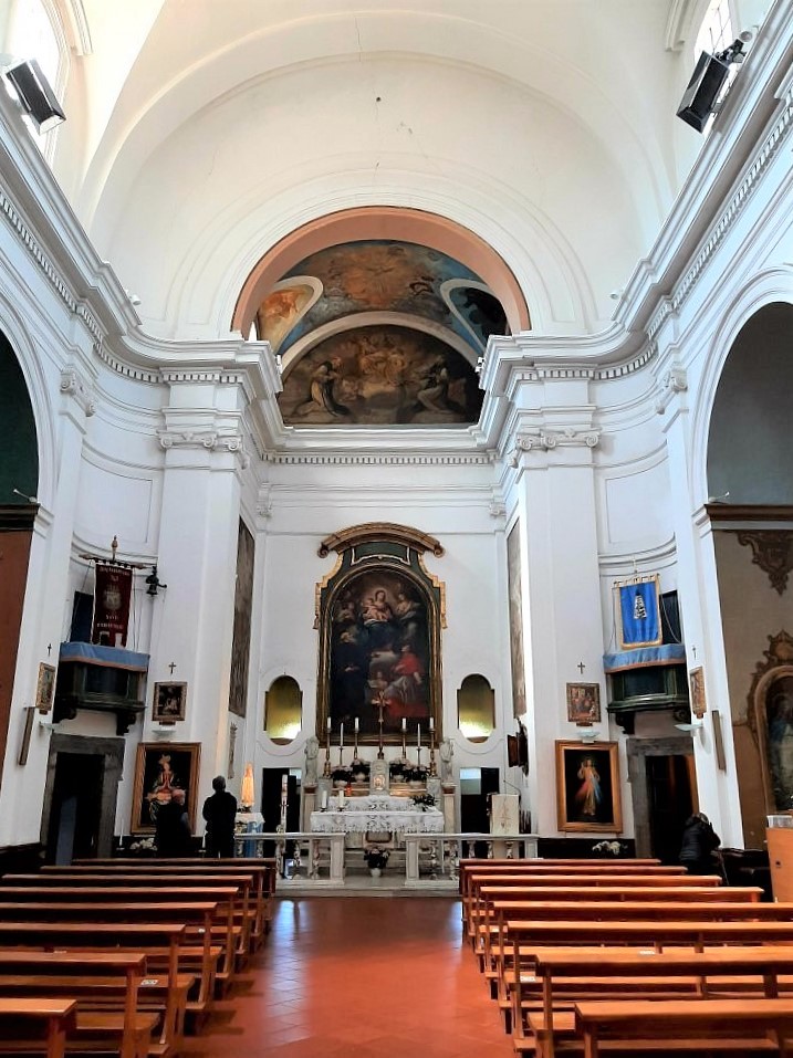 Le strutture portanti verticali dell’edificio sono in muratura di tufo locale; le strutture di orizzontamento sono costituite da volta a botte sulla navata centrale, da volte a botte sulle nicchie laterali e da volta a botte sul presbiterio decorata con affreschi raffiguranti scene di Santi. Nella parte superiore della navata vi sono tre finestre per lato mentre ai lati del presbiterio sono presenti due finestre circolari.