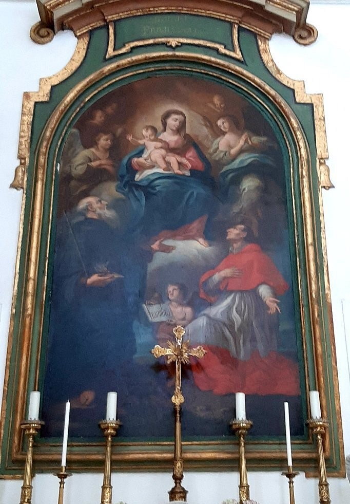 La pala dell’altare maggiore (XVIII secolo?) raffigura la Madonna col Bambino e in basso sant’Antonio abate (che tiene con la mano destra bastone e libro con sopra il fuoco) a sinistra e a destra un altro Santo.