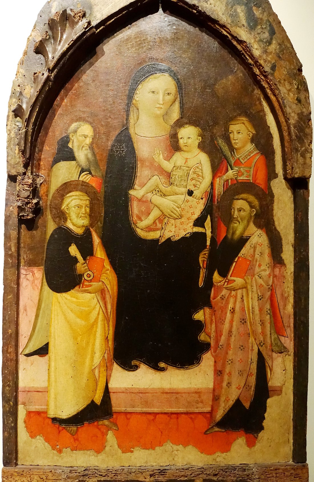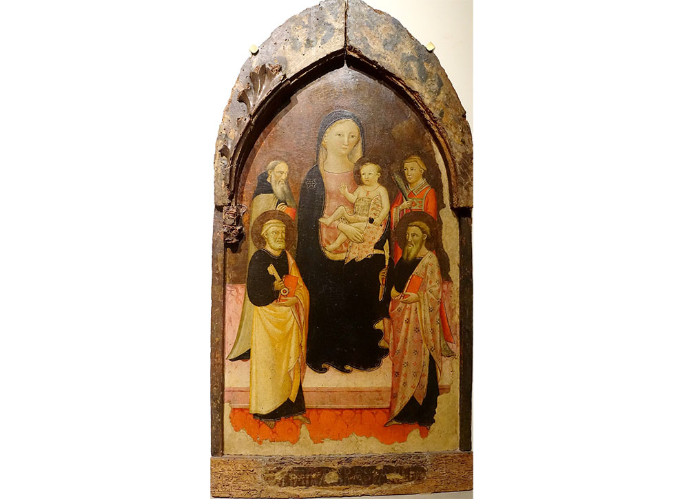 Tempera su tavola raffigurante “Madonna col Bambino tra i santi Antonio abate, Lorenzo?, Pietro, Bartolomeo”, proveniente dalla Chiesa di Sant’Jacopo a Voltigiano. Probabilmente era una pala d’altare; realizzata nel1430 – 1435 da ignoto pittore toscano.