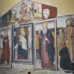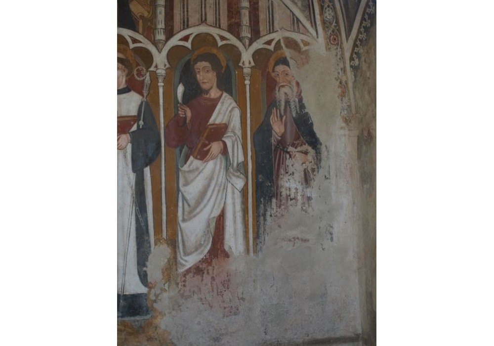 All’esterno, riscoperti sotto uno strato di intonaco, sono tornati visibili una serie di santi, tra cui san Bernardo in trono, e nel sottarco i profeti Abacuc e Isaia.