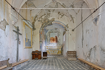Tre medaglioni con cornice in stucco decorano i soffitti delle tre campate in cui è divisa e raffigurano tre scene della vita di Sant’Antonio abate, opera di pittori locali.