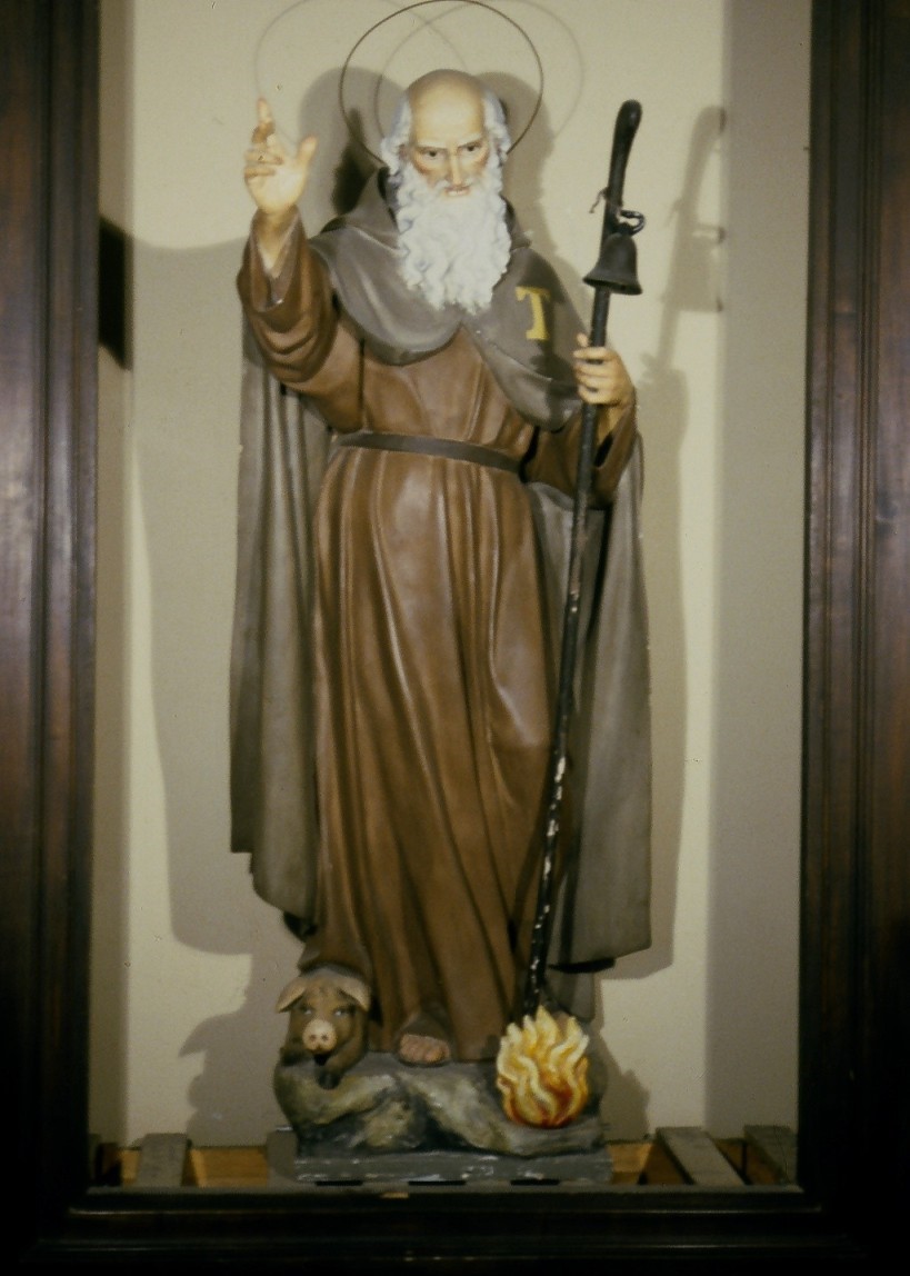 Il Santo tiene con la mano sinistra un bastone cui è appesa una campanella e la destra è aperta appoggiata al petto. A sinistra spunta il muso di un maiale.