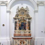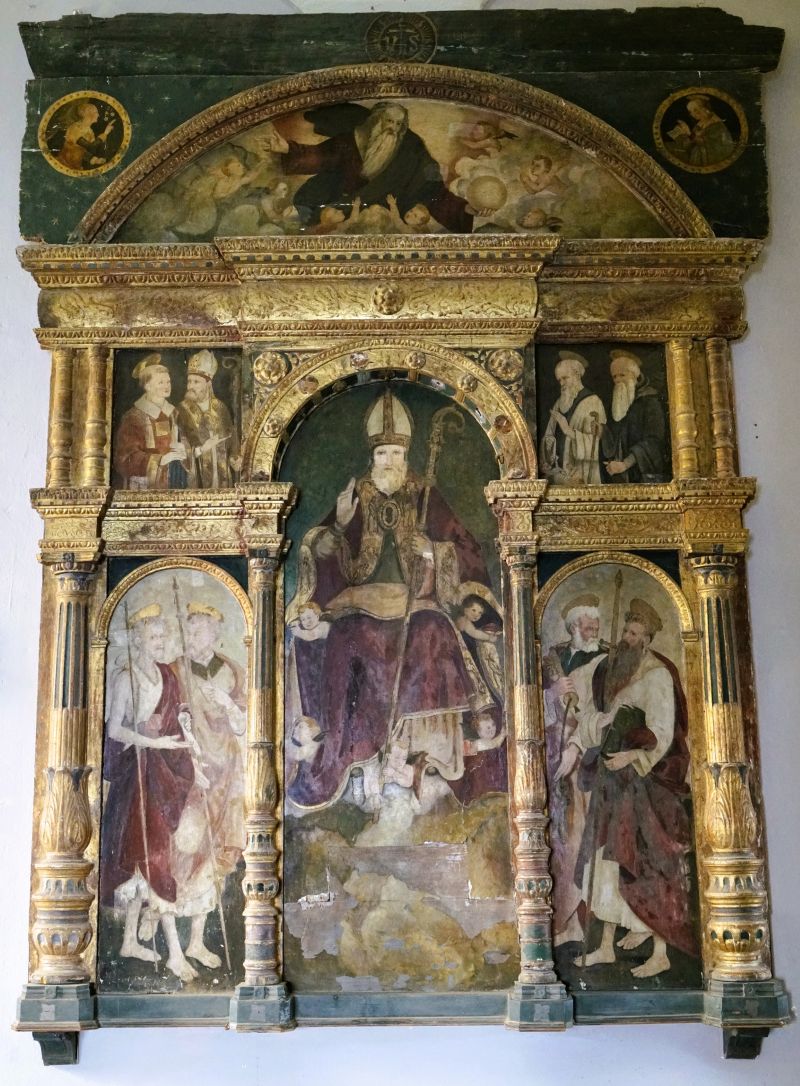 All’interno, a sinistra della porta maggiore si trova il nicchione destinato a contenere il portacatino battesimale. Sotto la prima arcata delle trabeazioni di sinistra è collocata la statua lignea di possenti dimensioni raffigurante la Trinità.