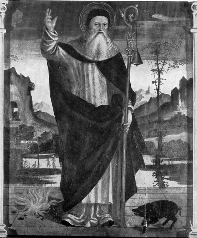 Sant’Antonio è raffigurato con saio chiaro e mantello scuro, barba biforcata. La mano destra compie il gesto di benedizione, la sinistra tiene un bastone pastorale cui è appesa una campanella. Ai suoi piedi, a sinistra il fuoco e a destra un maiale scuro che sembra in precario equilibrio.