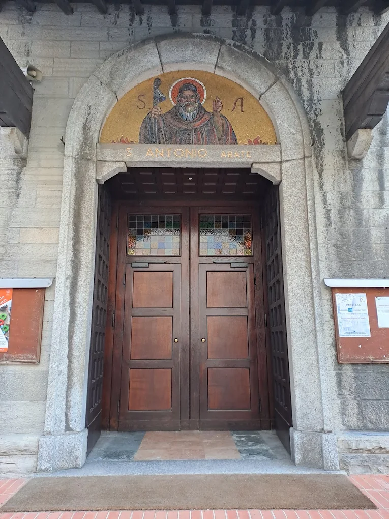 Facciata a capanna con oculo e archetti neoromanici. Sopra il portale, protetto da una tettoia, una lunetta con la figura a mezzobusto di s. Antonio abate.