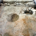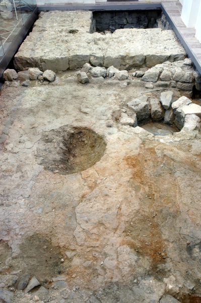 Sembra che il luogo venisse occupato per la prima volta nella tarda età imperiale da un complesso produttivo-artigianale, comprendente una cisterna in muratura con volticina in cocciopesto ed un “focolare”. Queste strutture, situate presso il perimetrale sud della chiesa, erano servite da una stradina lastricata che correva con andamento NO-SE, seguendo il naturale pendio del terreno.