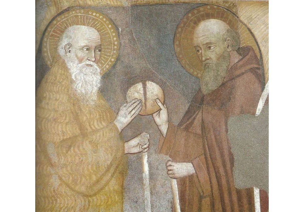 Accanto alla porta centrale: a sinistra affresco del ‘400 di scuola Viterbese raffigurante la Vergine che regge il Bambino, S. Giovanni Evangelista e S. Antonio abate. E’ molto sciupato perché, ricoperto con latte di calce come tutti gli altri affreschi, ignorandosene l’esistenza fu danneggiato durante lavori successivi.
