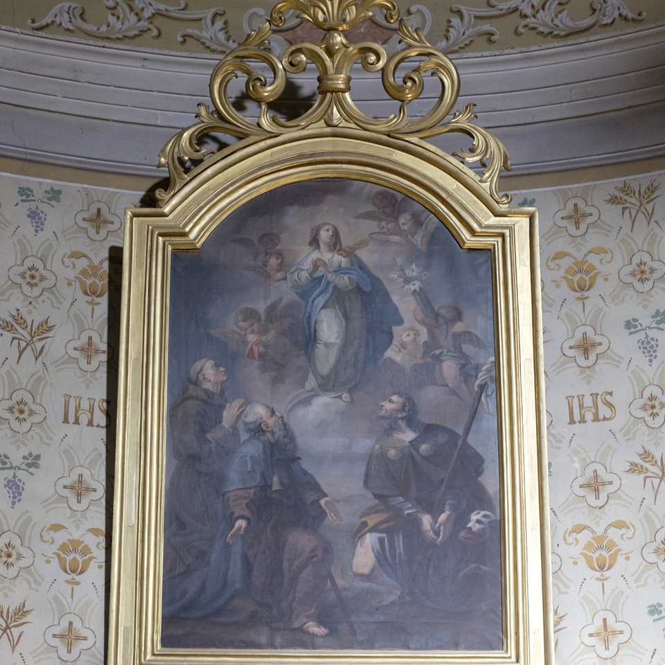Nel semicatino la Santa Trinità in mandorla con angeli che le fanno corona. Molto belli nella raffigurazione pittorica e con i colori molto ben conservati. Purtroppo la scena è in gran parte andata persa.