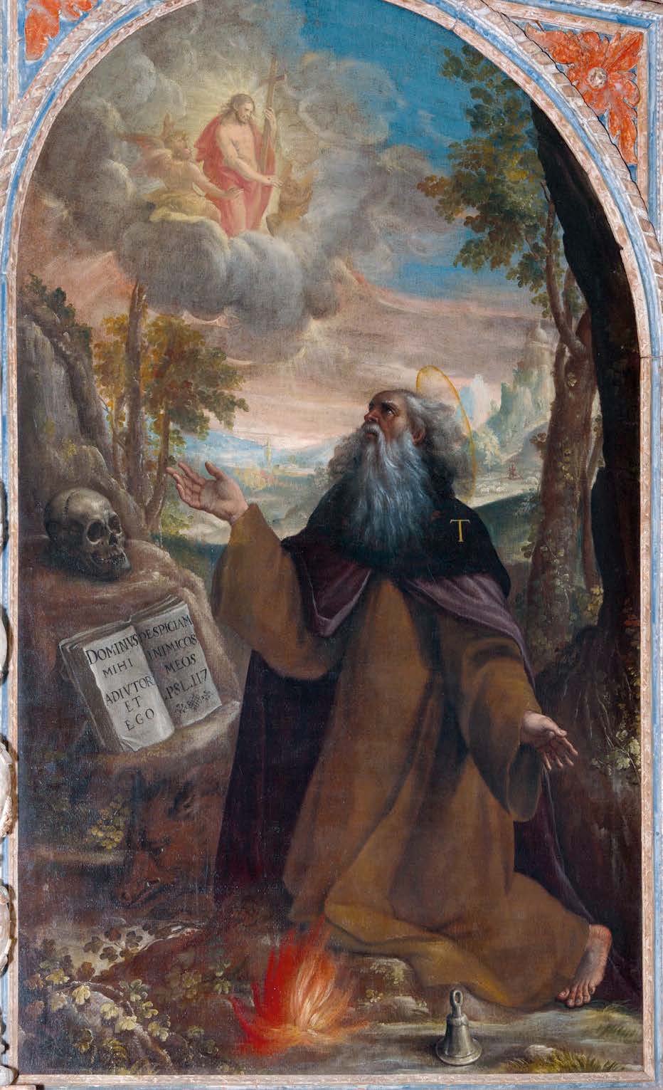Nell’inventario del 1717 è citata sopra il portale “in pittura l’immagine di S. Antonio abate”. La statua è quindi posteriore a questo anno e potrebbe risalire al 1776, data presente sulla cornice al di sotto della statua.