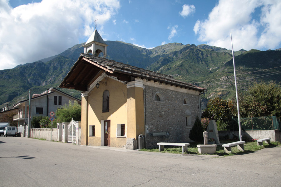 La cappella, di modeste dimensioni, ha una copertura a beole che sporge sulla facciata, ed un campanile impostato sulla parte sinistra del tetto.
