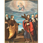 In primo piano si trovano l’Arcangelo Michele nell’atto di trafiggere con la lancia il demonio.