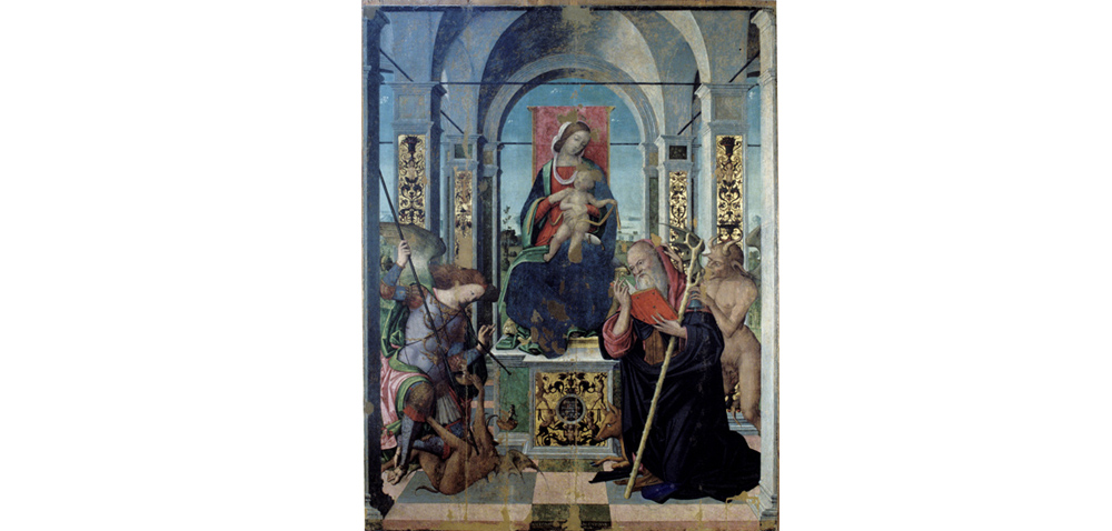 Tempera su tavola di 208 x 170 cm, opera del 1510 di Antonio Aleotti (Argenta, doc. dal 1494 – Cesena, 1527) – raffigurante: “Madonna in trono col Bambino, Sant’Antonio abate e l’Arcangelo Michele”.