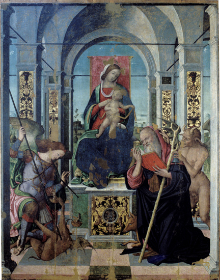 La scelta compositiva di ambientare la scena in un porticato risulta felice perché l’azzurro terso del cielo, che s’intravede nella parte superiore della tavola, rende più sereno l’ambiente in cui si svolgono scontri tra le forze del bene e del male. Infatti in primo piano San Michele da una parte, Sant’Antonio dall’altra non adorano la Vergine come ci si aspetterebbe, ma sono alle prese con i demoni. La Madonna, in trono con il Bambino in braccio seduta su di un trono, è leggermente arretrata rispetto a queste figure, ma le domina perché posta su di un alto piedistallo da cui sembra vegliare la singolare tenzone. Domina il dipinto una gamma di colori freddi, pur spiccando il rosso della tunica della Vergine e del suo schienale, nonché il libro ed alcune parti dell’abito di Sant’Antonio. Il Viroli (1995) ritiene che in questo caso l’Aleotti emuli, un po’ stentatamente, il Palmezzano come indicherebbero lo schema compositivo nel rapporto tra figure, paesaggio e architetture, e l’ornato a grottesche. Testo tratto da:  https://bbcc.ibc.regione.emilia-romagna.it/pater/loadcard.do?id_card=58913