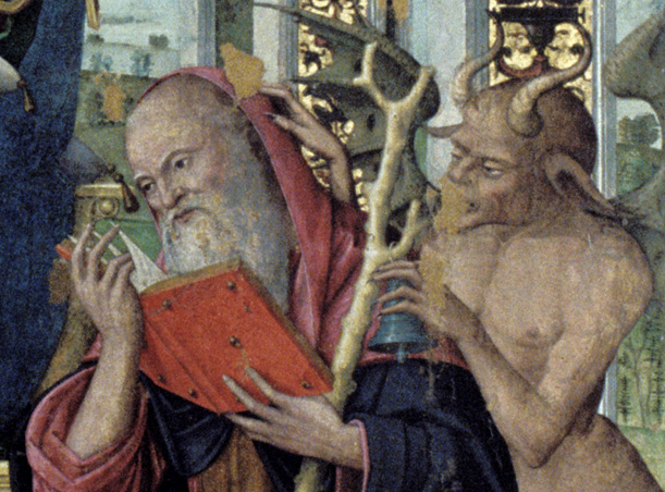 Sulla destra, sant’Antonio inginocchiato tiene in mano un libro, mentre un demone lo afferra alle spalle. Accanto vi è un maialino, di cui si vede soltanto la testa.