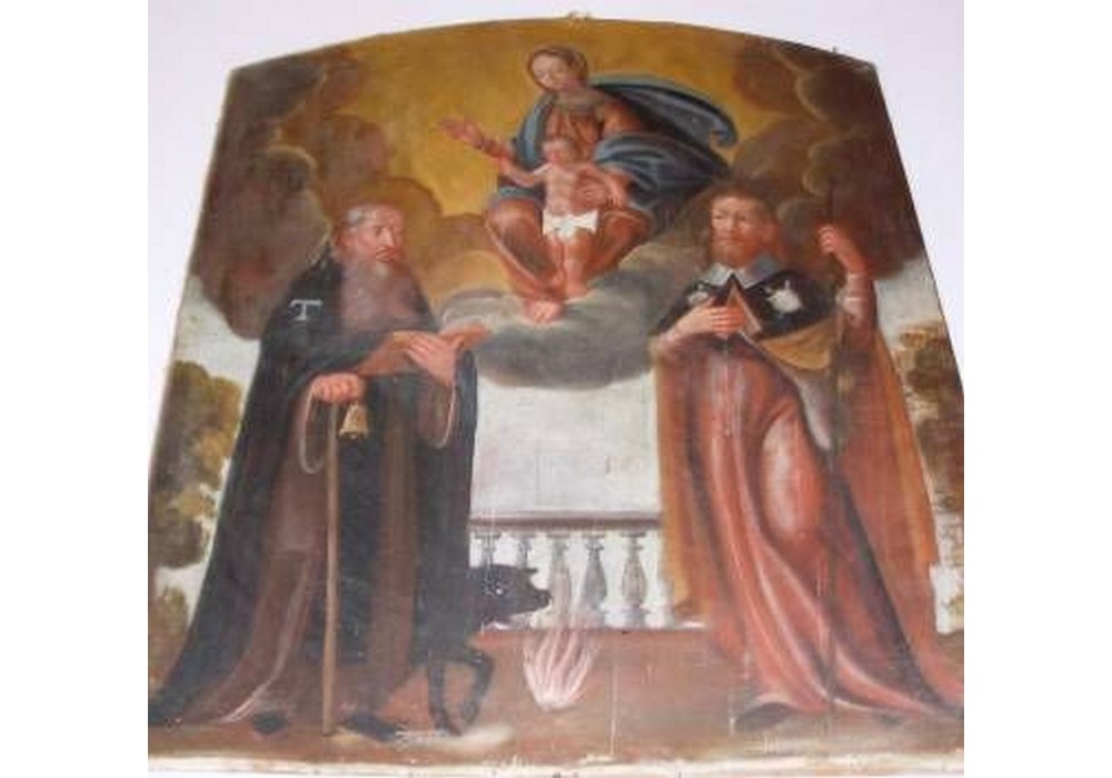 Il quadro con la Madonna, il Bambino, S. Antonio e S. Giacomo, che era l’icona dell’altare nella precedente cappella, è attribuito a Jacques Roux, canonico della prevostura di Oulx.
