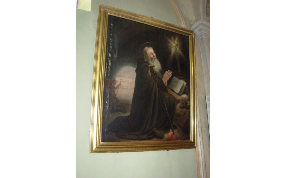 Il quadro (immagine in basso) ha una struttura complessa: il Santo, inginocchiato all’interno di una grotta davanti a un libro e a un teschio posati su di un rilievo roccioso, è in atteggiamento di adorazione dinanzi alla Croce; al suo braccio destro è appoggiato il bastone con la campanella, mentre ai suoi piedi è rappresentata la fiamma. Sulla sinistra dello sfondo un diavolo, che regge con le mani un tridente, posa il piede sinistro su di un maiale. Nella tela spiccano due fonti luminose: la prima proviene dalla Croce; la seconda è un alone luminoso (ai margini del quale si trova il diavolo), che lascia intravedere al suo interno alcune costruzioni.