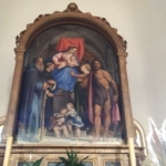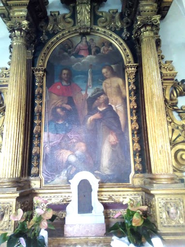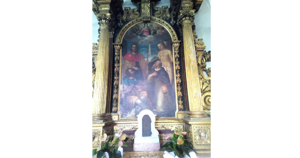 Al centro dell’aula, a sinistra, l’altare ligneo settecentesco di San Rocco con la pala della Madonna in gloria tra i santi Rocco, Giacomo, Sebastiano e Antonio abate di Francesco Matteazzi (XVII secolo).