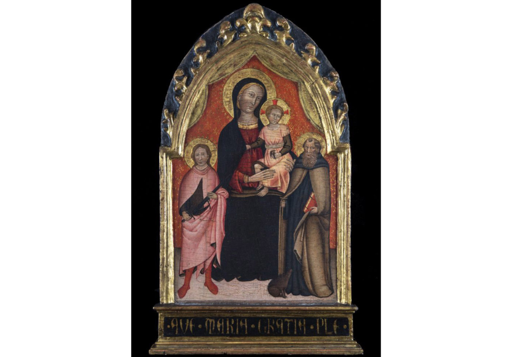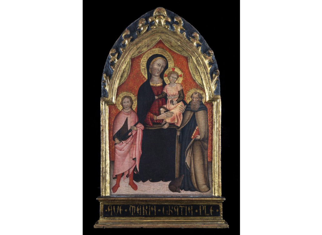 “Il centro della composizione di questa anconetta di devozione domestica è occupato dalla Madonna seduta in trono con il Bambino, a fianco della quale due santi, secondo un arcaico criterio gerarchico, sono raffigurati con dimensioni inferiori. A sinistra è San Giuliano, con spada e mantello, e a destra Sant’Antonio abate, osservato dal maiale accucciato ai suoi piedi; il Santo ha nella mano destra il bastone a tau e nella sinistra il consueto libro rosso.