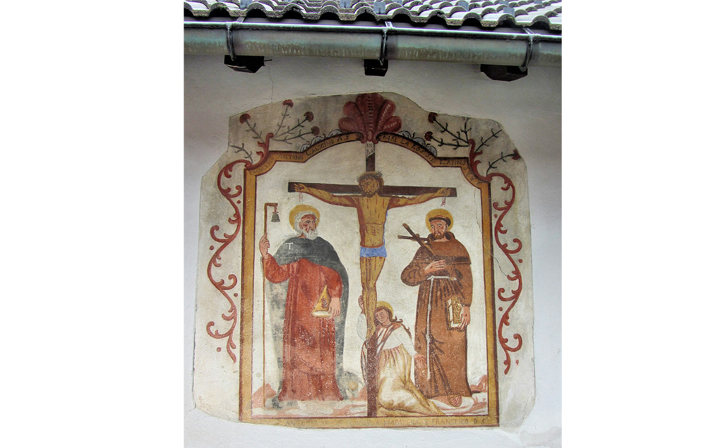 A sinistra la figura di Sant’Antonio abate, con una tau sul mantello, che tiene con la mano destra un alto bastone terminate a “L” cui è appesa una campanella; con la sinistra un libro.