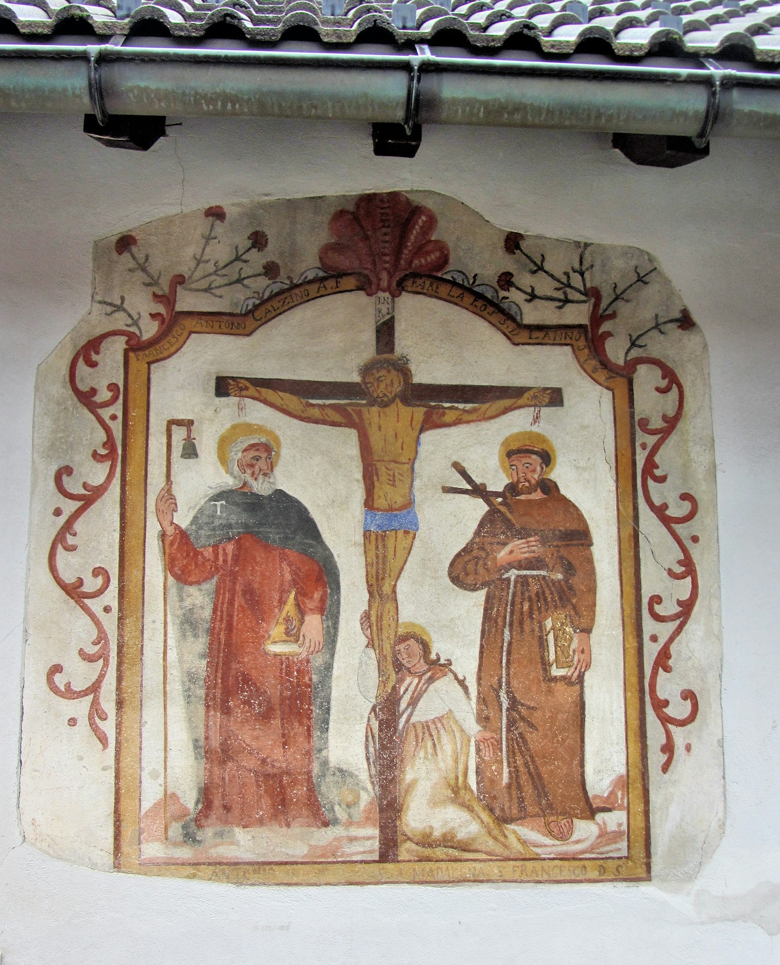 La scritta in calce “S. Antonio, S.M. Maddalena, S. Francesco D S.”. La scritta in alto, non del tutto chiara, sembra indicare non l’artista ma il committente: “Francesco Antonio Calzino (h)a f(atto) fare la P.OS(?) S D l’ anno 1787 (o 1767)”