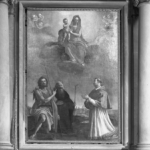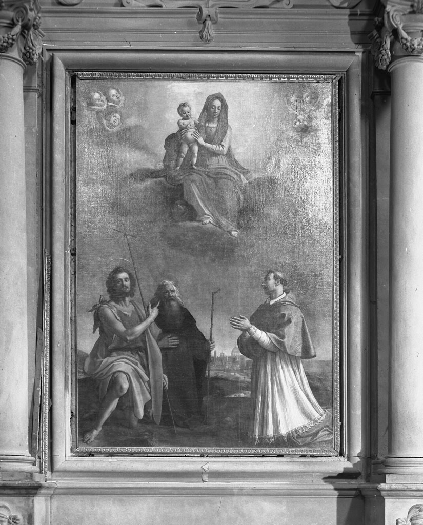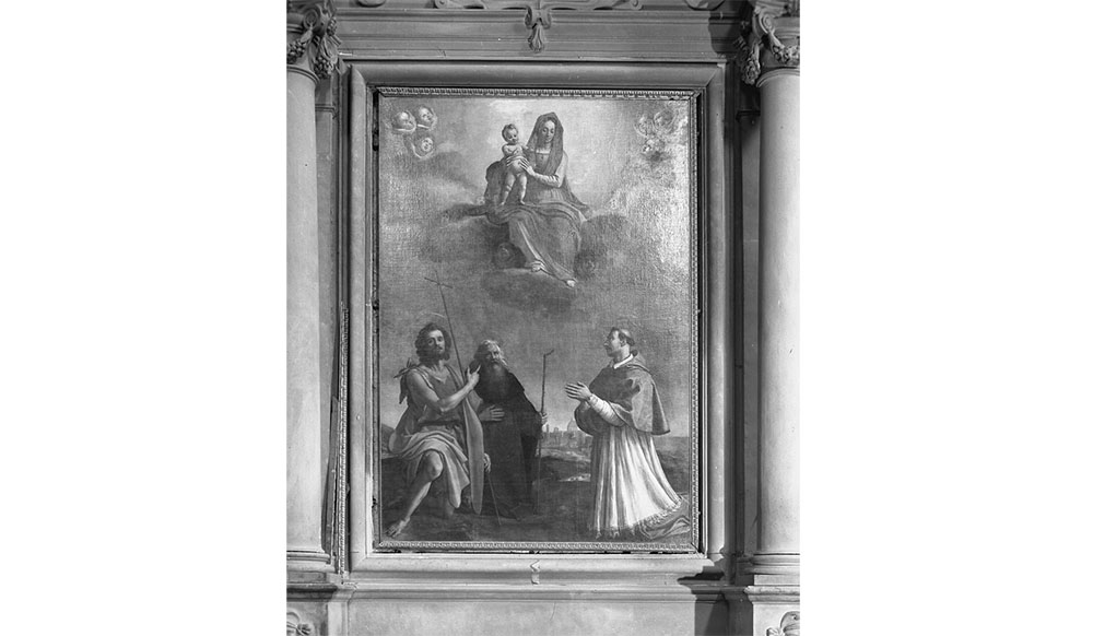 Olio su tela di 327 x 233 che raffigura la “Madonna in gloria col Bambino, i SS. Giovanni Battista, Antonio abate e Carlo Borromeo”, datato 1618.