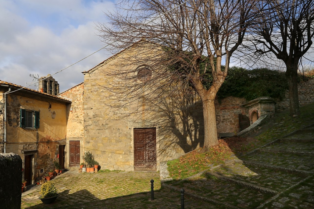 La facciata della chiesa è a bozze di pietra serena rifatta posteriormente nella parte centrale. La pianta dell’antica chiesa era a navata unica. Tra il ‘500 e il ‘600 furono aggiunte due strette navate laterali, che corrispondono all’attuale oratorio e al sottostante campanile, che anticamente era a torre, ma nella prima metà del ‘600 fu sostituito con l’attuale a vela.