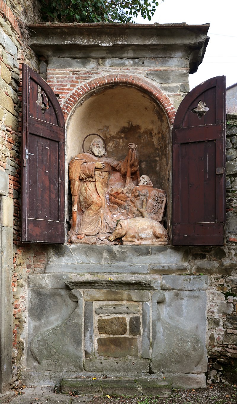 L’edicola ha all’interno una scultura con s Antonio abate (sullo scapolare ha una croce invece del tau). Un grosso maiale è accucciato ai suoi piedi. L’opera è risalente al secolo XVII – XVIII.