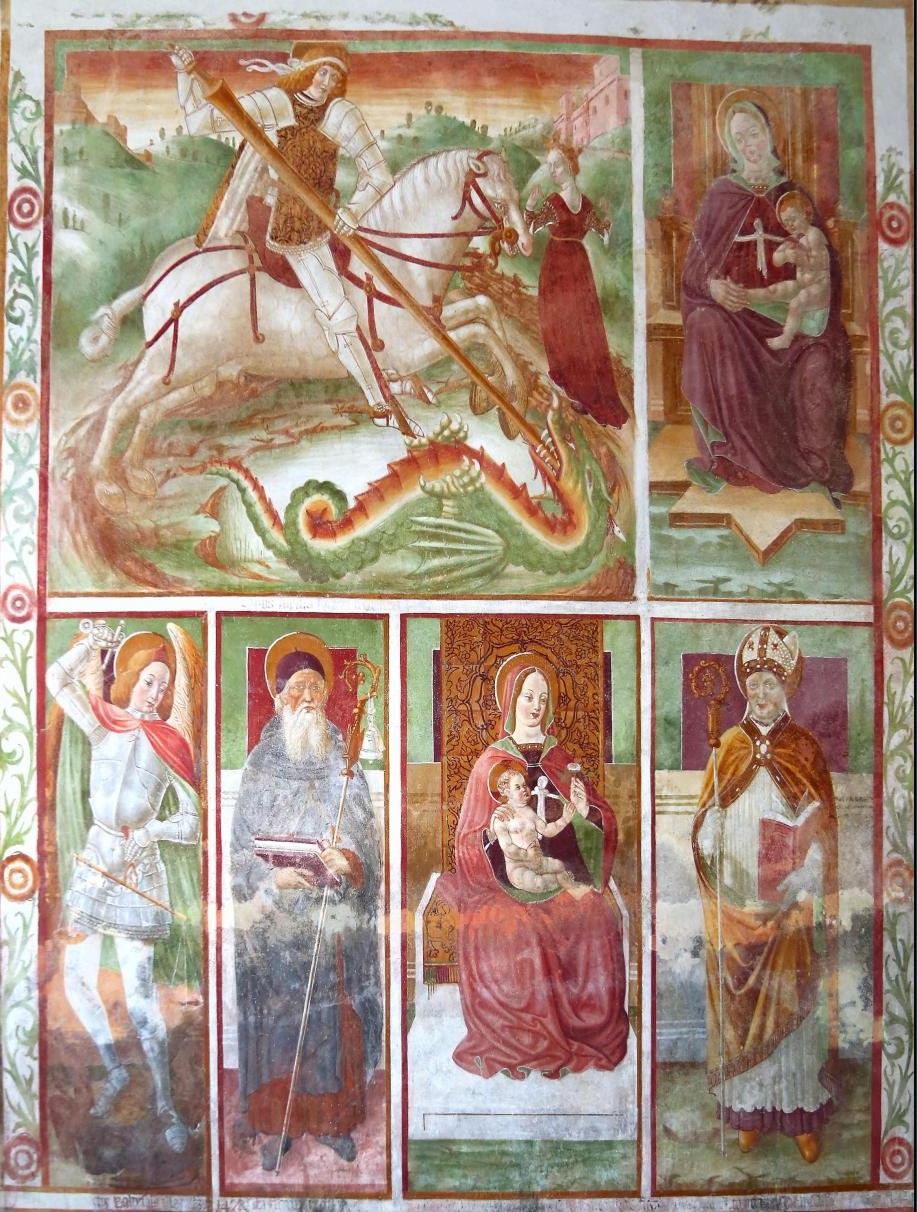 La serie di sei riquadri (cm 352 x 297) è ripartita su due registri ed è racchiusa da una cornice a clipei circolari e ramificazioni fogliate. Nella fascia superiore è raffigurato san Giorgio a cavallo che trafigge il drago, sullo sfondo un paesaggio di lago con colline, rocce e castelli; a lato una Madonna in trono col Bambino.
